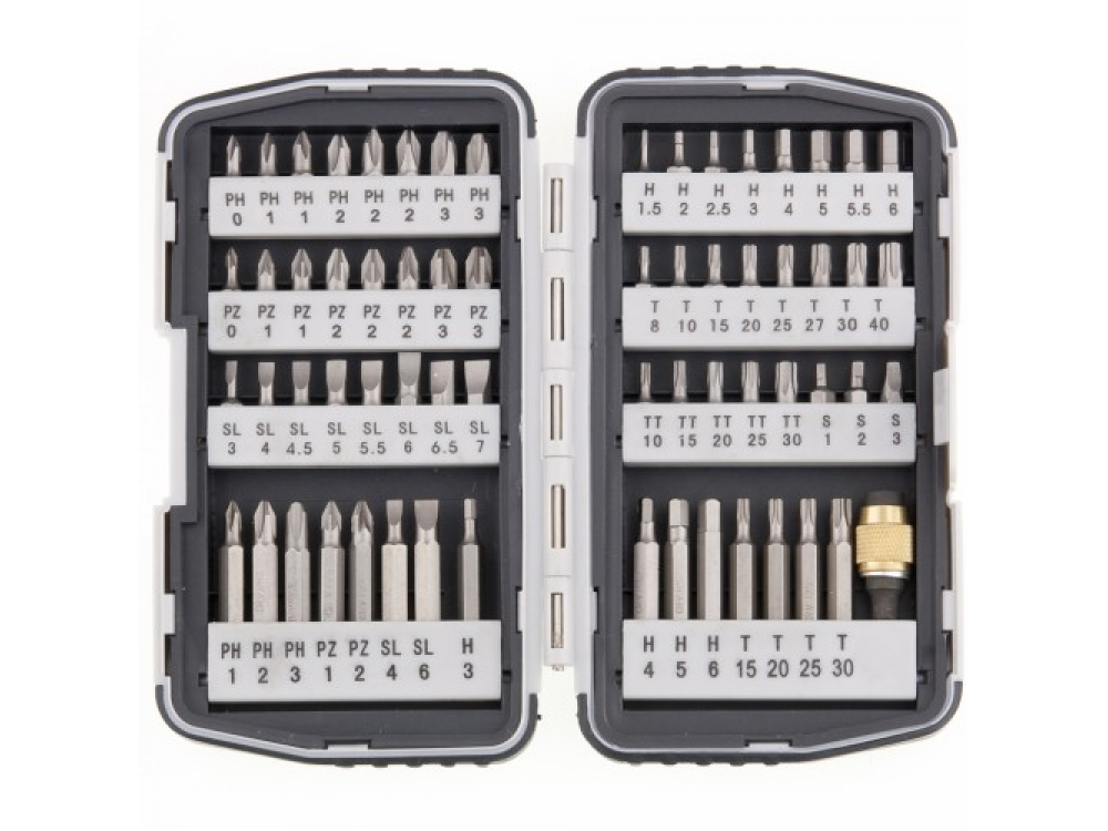 РН № 0, 1, 2, 3; РZ № 0, 1, 2, 3; SL 3, 4, 4.5, 5, 5.5, 6, 6.5, 7 мм; HEX 1.5, 2, 2.5, 3, 4, 5, 5.5, 6; TORX 8, 10, 15, 20, 25, 27, 30, 40; ТТ 10, 15, 20, 25, 30; R 1, 2, 3;