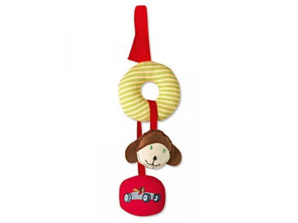 С 2 подвесными игрушками: красная вязаная погремушка с аппликацией гоночного автомобиля и плюшевая голова медвежонка-автогонщика со вшитой внутрь шуршащей пленкой. Размеры: 26 х 10 см. Артикул: 320.11.015.00