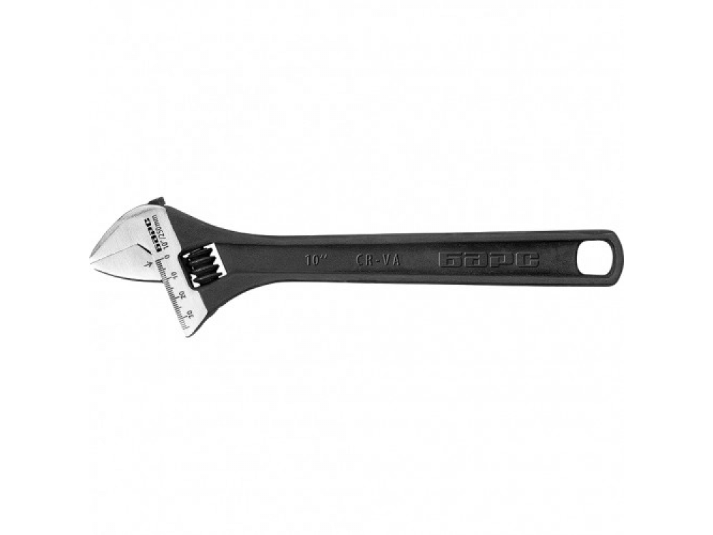 Рожковый разводной ключ изготовлен из хромованадиевой стали, губки закалены токами высокой частоты. Встроенный в тело ключа червячно-винтовой механизм защищен от коррозии. Усиленная конструкция позволяет работать с повышенными нагрузками. Головка ключа имеет мерную шкалу для определения размера деталей. Фосфатированное антикоррозийное покрытие.